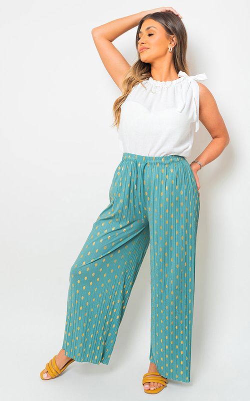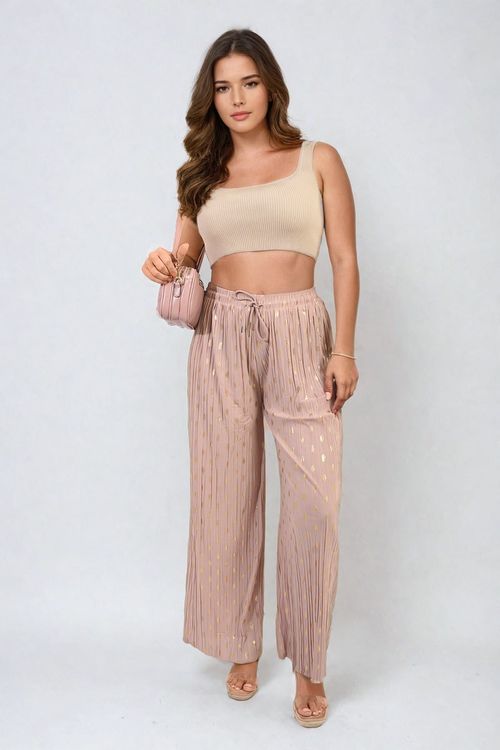 Elevate your wardrobe with the Ella Gold Spot Pleated Trousers with Drawstring and step out in style that truly shines. 🌟💖